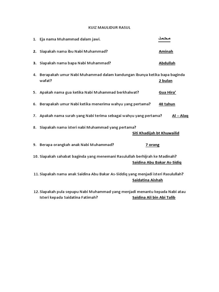 Aminah binti wahab bin abdul manaf. Muhammad saw disusukan oleh ummu aiman pada mulanya. Pada pagi hari isnin, 12 rabiul awwal tahun gajah, aminah telah selamat melahirkan nabi muhammad di rumah abu talib yang terletak di perkampungan bani hasyim. Ayah nabi muhammad saw adalah abdullah bin abdul muththalib. Muhammad bin 'abdullah bin 'abdul muttalib bin hashim. Jumlah keseluruhan istri nabi muhammad adalah 13. Saudara sesusu rasulullah saw ibu susuan saudara susuan 1. Khadijah bintu khuwailid saudah bintu zamah bin qois aisyah bintu abi bakr as.